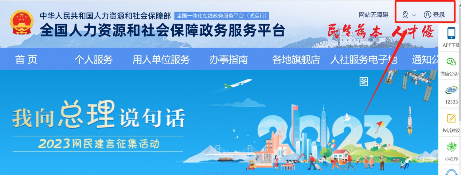 1、登录全国人社政务服务平台(http://zwfw.mohrss.gov.cn/),完成注册登录;