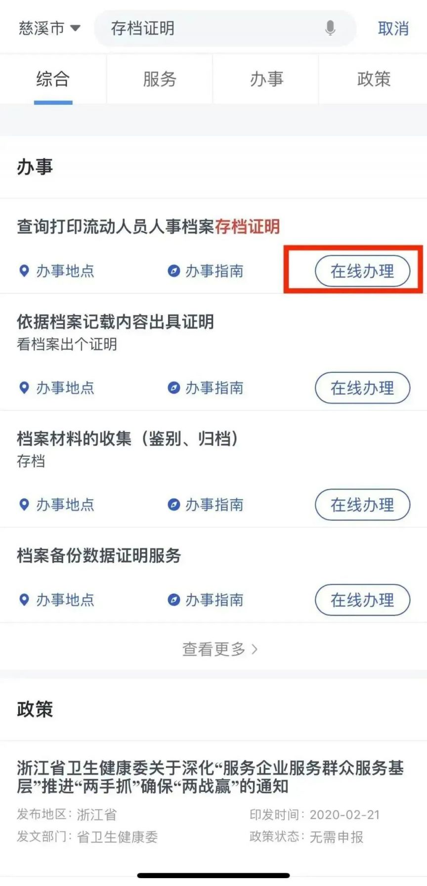 “ 浙里办 ”APP或者“浙江政务服务网”注册登录个人账户,搜索“存档证明”—点击“在线办理”—进入办事—同意授权—在线填表。