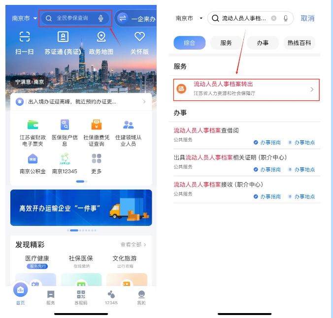 ①登录“苏服办”APP,在首页搜索“流动人员人事档案查询”。