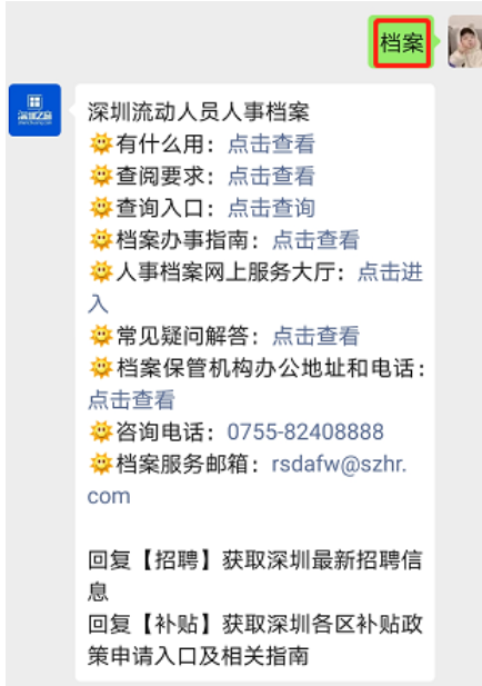 微信搜索关注【深圳之窗】公众号,对话框发送关键词【档案】即可获取流动人员人事档案线上查询入口及相关指南。