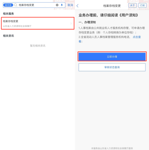 如果你想将个人存档转换为单位存档,还可以登录“爱山东”APP、“爱山东”微信、支付宝小程序,首页搜索办理“档案存档变更”业务。
