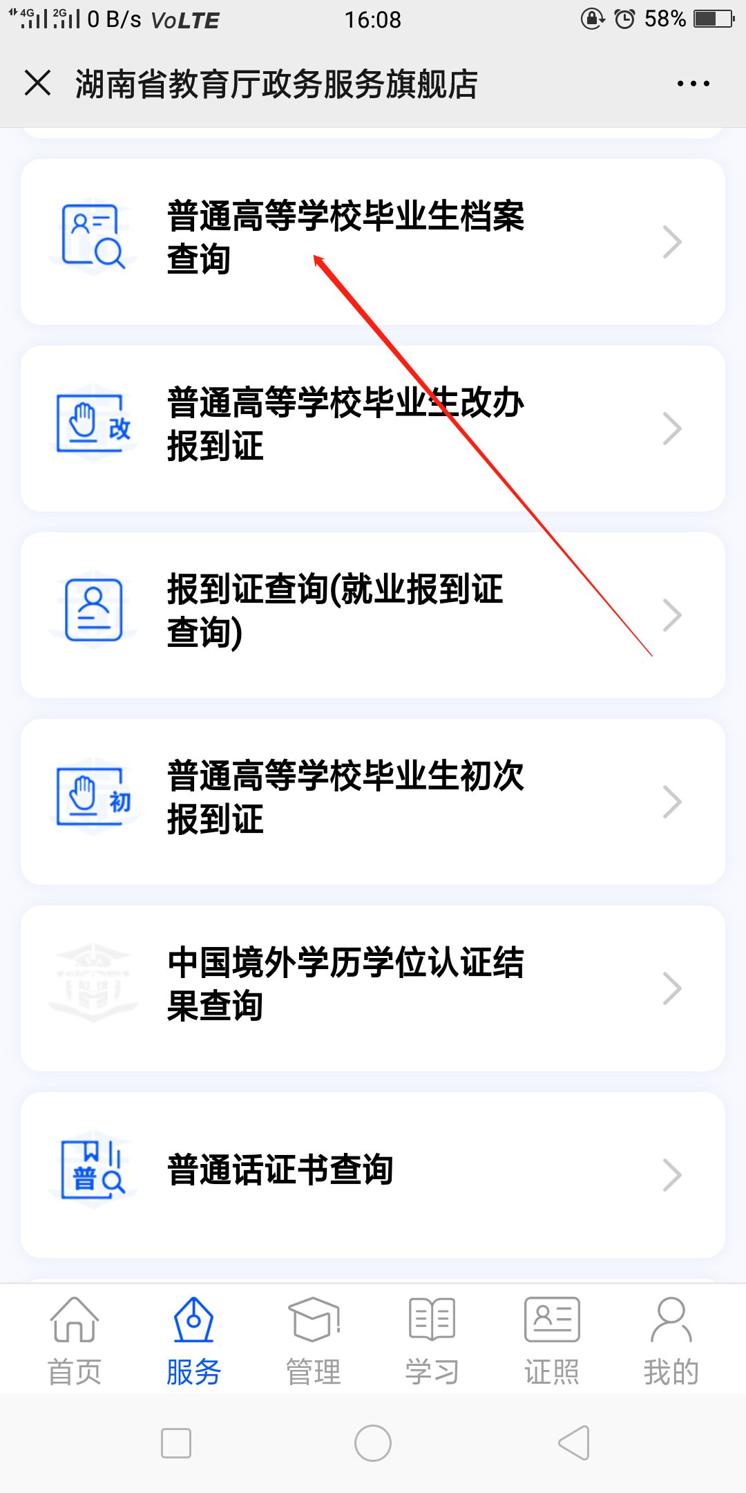 第三步,点击下方菜单栏“服务”,将页面向下滑动,找到并点击“普通高等学校毕业生档案查询”;