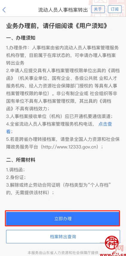 工作单位有档案保管权限、想要转移档案的流动人员还可以在“爱山东”济南分厅办理“流动人员人事档案接收”,开具《流动人员人事档案调函》(简称调档函)后,再办理“流动人员人事档案转出”。