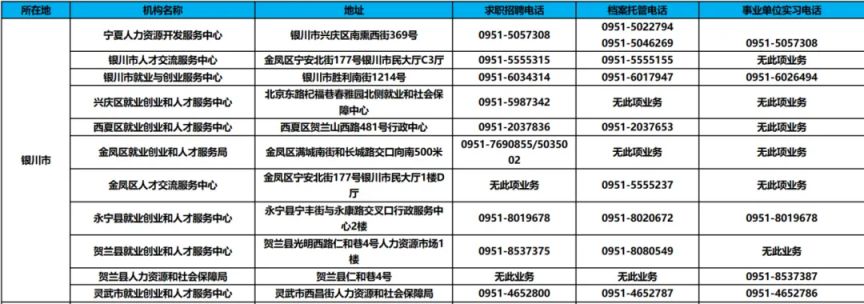 吴忠市:包括吴忠市就业创业和人才服务中心(地址:吴忠市利通区金星镇开元大道 544 号,电话:0953-2036598)等。
