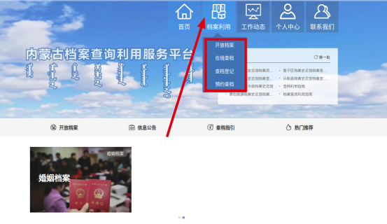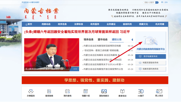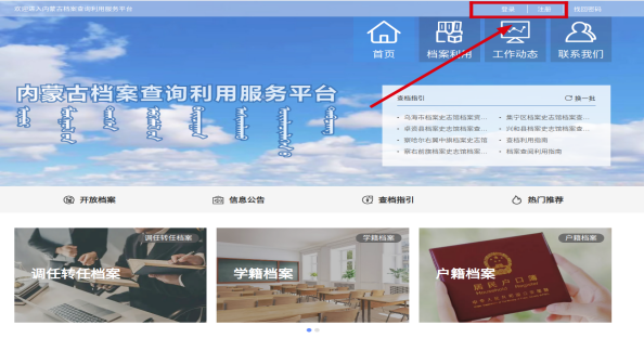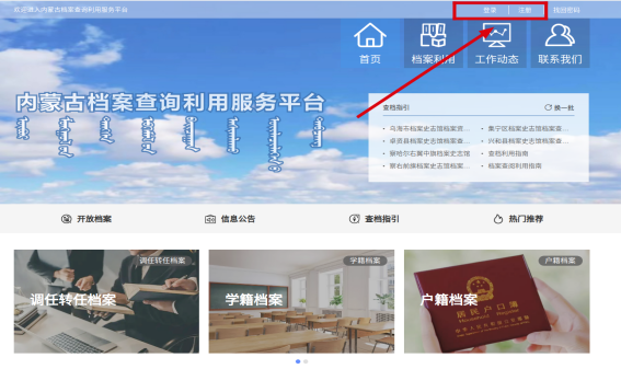 1.打开浏览器搜索“内蒙古自治区档案馆”(http://www.archives.nm.cn/),进入官网页面。点击右上角的“内蒙古档案查询利用服务平台”。