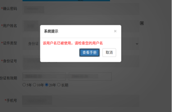 4.如果出现下图中的情况,可以点击“查看手册”,根据手册中的内容步骤进行身份认证(在近期一年内办理新的身份证的用户易出现此问题)。认证完成后重新进行注册即可。