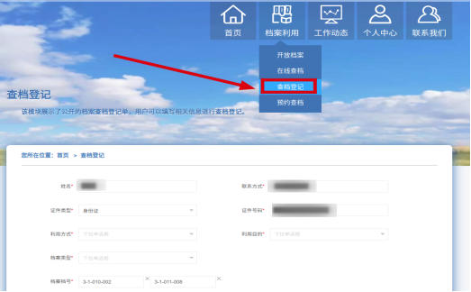 3. 如在公开档案中未查询到自己需利用的档案时,可在“查档登记”中在线填写查阅内容(需描述清楚),并上传个人证明材料及其他信息。填写利用目的、利用方式、受理单位等必填字段,点击“提交”按钮即可,后续该登记单会根据具体业务到档案馆进行审批,审批通过后,本人可根据填写的利用方式,获取到档案。审批结果可在个人中心的受理通知中进行查看。