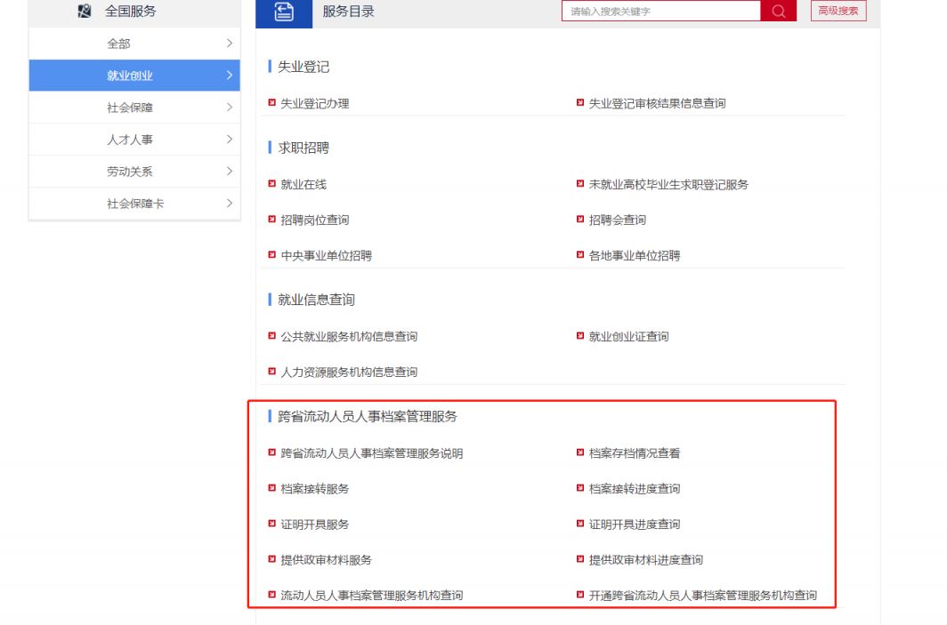 1、登录全国人社政务服务平台并注册,在“就业创业”板块的“跨省流动人员人事档案管理服务”专栏进行查询。目前,该平台支持档案基础信息数据已被上传平台的流动人员在线查询存档情况。