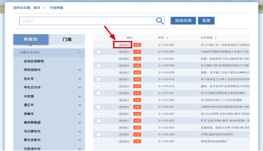 1.开放档案展示的数据为档案馆工作人员进行发布的公开的档案条目,可以对档案目录、题目、责任者、档号进行检索,具有在线查档申请、查档登记和纠错等功能,如未查到需要查档的目录,可在“预约查档”中进行登记或预约。如下图所示: