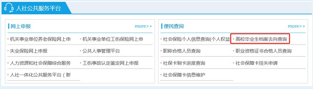 石家庄市人力资源和社会保障局网站专门开辟了毕业生档案去向查询链接,登录http://rsj.sjz.gov.cn/后,在“网上服务大厅”专题栏目点击“高校毕业生档案去向查询”,按提示填写相关内容后,即可查询1997以来已到我市的毕业生档案去向情况。