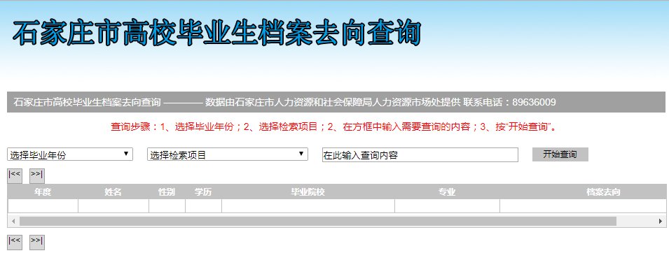 《石家庄市人力资源和社会保障局》官网专门开辟了毕业生档案去向查询链接,登录https://rsj.sjz.gov.cn后,在“便民查询”专题栏目点击“毕业生档案去向查询”,按提示填写相关内容后,即可查询1997以来已到我市的毕业生档案去向情况。