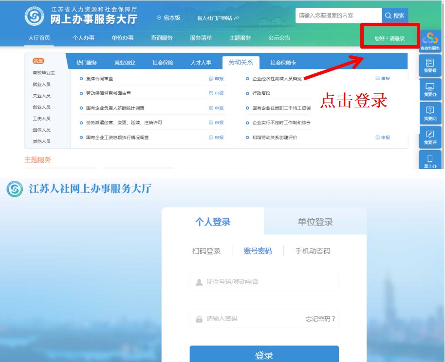 1、进入江苏人社网办大厅——点击右上角登录按钮进行个人登录